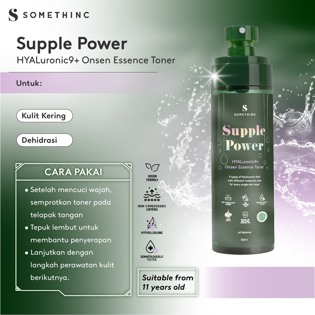 ⭐️ SOMETHINC SUPPLE POWER Hyaluronic9+ Onsen Essence Toner Ukuran: 40ml & 120ml BPOM: NA18211200622 Menghidrasi Lebih Dalam dengan 9 Layer Hyaluronic Acid + Onsen Sui Hydrating Toner yang mengandung kesegaran 79% Onsen Belgium Hot Spring Water dan 9 Hyaluronic Acid yang mampu menghidrasi kulit hingga pori-pori terdalam, menjaga elastisitas kulit, & mempersiapkan kulit untuk menyerap serum + pelembab secara maksimal.
