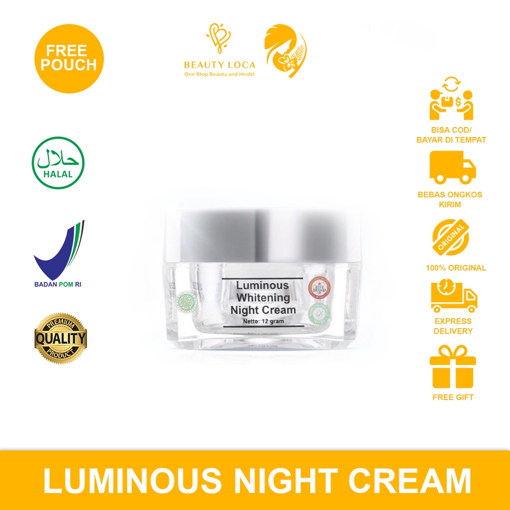whitening luminous night cream diformulasikan untuk Hempas noda pada wajah dan menghaluskan struktur kulit rusak ️ Kandungan dalam cream malam whitening luminous yaitu whitening active, chroma bright dan stem cell.