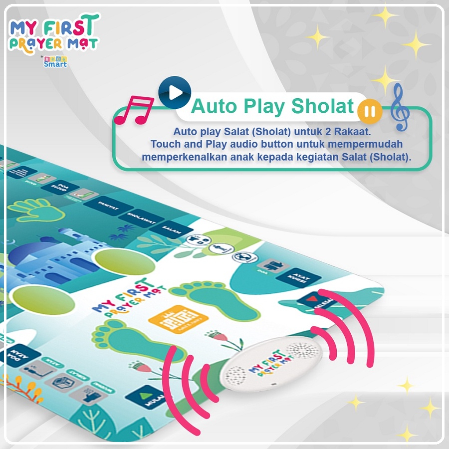 Fitur My First Prayer Mat : Sajadah Interaktif dengan 2 Rakaat yang sederhana untuk memperkenalkan anak kepada kegiatan Salat ( Sholat ). Proses ini harus di dampingi oleh orang tua.