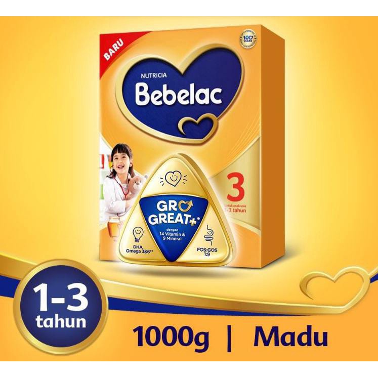 BEBELAC 3 merupakan susu bubuk untuk pertumbuhan anak usia 1-3 tahun. Susu ini memiliki pilihan rasa yang lezat serta dilengkapi nutrisi Minyak ikan, Omega 3, Omega 6, FOS:GOS 1:9, 13 Vitamin & 9 Mineral. Susu ini merupakan nutrisi tepat dari Bebelac dan stimulasi ibu, untuk dukung anak tumbuh hebat
