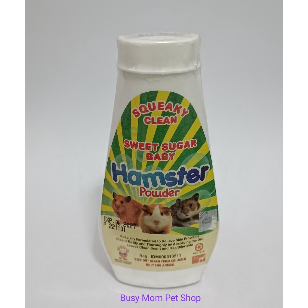 Bedak HAMSTER / Hamster Talcum Powder Digunakan untuk semua jenis hamster Keharuman sweet sugar baby Hamster Talcum Powder ini digunakan untuk mandi kering sehari - hari, dapat menyerap keringat dan tidak menggumpal. Hamster Talcum Powder ini juga mengandung triclosan sebagai anti bakteri, jamur dan iritasi serta dengan Zink Oxide sebagai anti ketombe. Kegunaan Hamster Talcum Powder memiliki keharuman sweet sugar baby yang dilengkapi dengan sulfur, salicylic acid sebagai anti jamur dan iritasi. Bedak ini juga dilengkapi dengan Cabaryl sebagai anti kutu, caplak dan pinjal dengan kadar yang aman sesuai rekomendasi dokter hewan. Cara Pemakaian Taburkan Raid All Squeky Clean Hamster Talcum Powder pada bulu hamster Anda. Usap dan bersihkan tanpa dibilas.