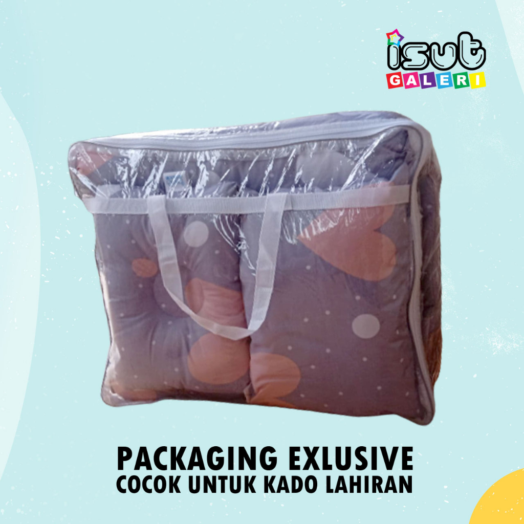 Terdiri dari : 1. Bedcover / bisa jadi alas bobo baby, ukuran 110x75m 2. Bantal peyang, 23x32cm 3. Bantal kotak, 25x40cm --> sarung bantal bisa dilepas 4. Guling 2pcs, panjang 50cm diamter 15 cm --> sarung guling bisa dilepas 5. Tas mika untuk penyimpanan