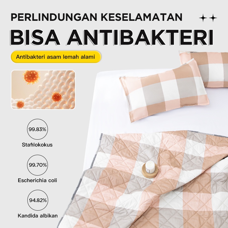 Bedcover kombinasi adem bahan halus single ini dibuat bersama sprei hotel, villa, dan mall. Dengan harga sprei terbaik di marketplace Indonesia, bedcover ini memiliki jahitan dan QC yang tinggi. Bahannya terbuat dari katun Jepang yang memiliki karakteristik kain yang lembut, dingin, dan tidak mudah luntur. Bedcover ini tersedia dalam tiga ukuran, yaitu 180 cm x 200 cm (KING), 160 cm x 200 cm (QUEEN), 120 cm x 200 cm (SINGLE).