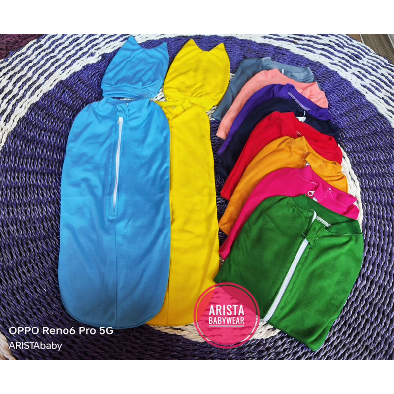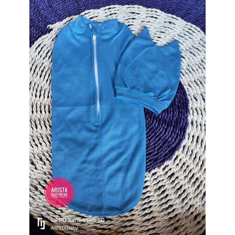 Detail Bedong instan bayi+topi warna polos, resleting depan praktis