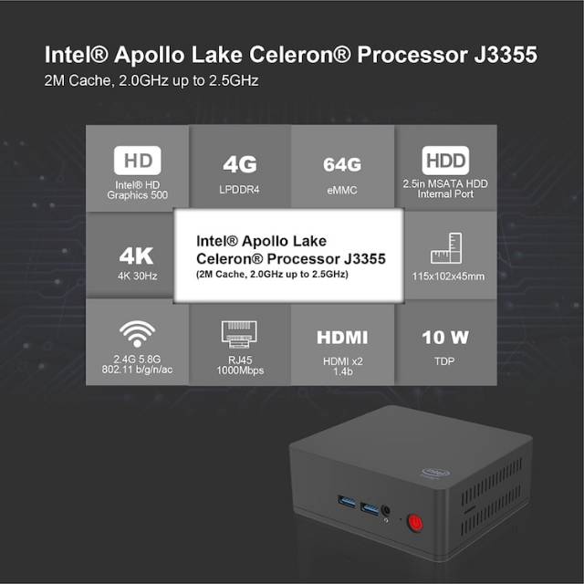 Spesifikasi : Model: Beelink AP35 Type: Mini PC CPU: Intel Apollo Lake J3355 GPU: Intel HD Graphics 500 RAM: 4G LPDDR4 ROM: 64G eMMC OS : Windows 10 Home 64Bit Original Activated HDD Bay expansion 2.5" Sata Port