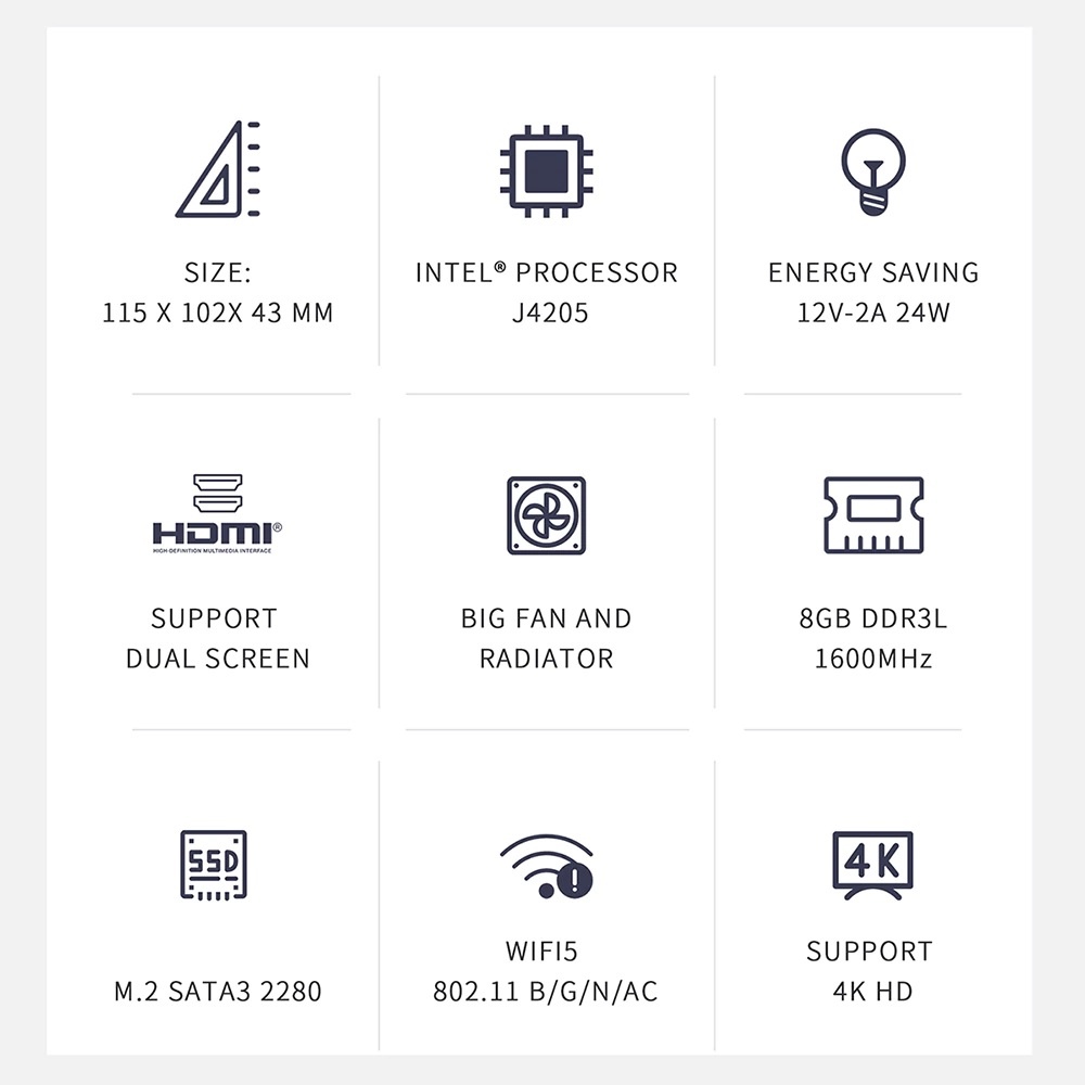Specification Brand: BEELINK Model: GK35 Type: Mini PC System: Windows 10 CPU: Intel Apollo Lake Celeron J4205 (2M Cache, 1.50GHz up to 2.6GHz) GPU: Intel HD Graphics 500 Memory: 8GB DDR3L Storage: 256GB SSD M.2 SATA3 2280 Expandable Storage: Up to 2 TB (2.5-inch 7mm SATA HDD) WiFi: Dual Band 2.4GHz/5GHz, 802.11 a/b/g/n/ac Bluetooth: 4.0 Interfaces: 4x USB 3.0 ports, 2x HDMI ports, 1x DC Jack port, 1x RJ45 1000M port, 1x Audio Jack port