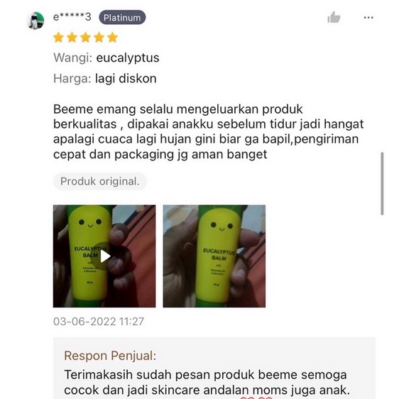 Balm yang terbuat dari Beeswax ringan dan mudah meresap dengan kandungan Eucalyptus Oil serta Citronella Oil. Melembabkan juga memberi sensasi hangat pada kulit serta menangkal gigitan nyamuk. Kandungan Eucalyptus nya mempunyai sifat antivirus dan antimikroba alami & dapat melegakan pernafasan. Aman digunakan untuk semua usia.