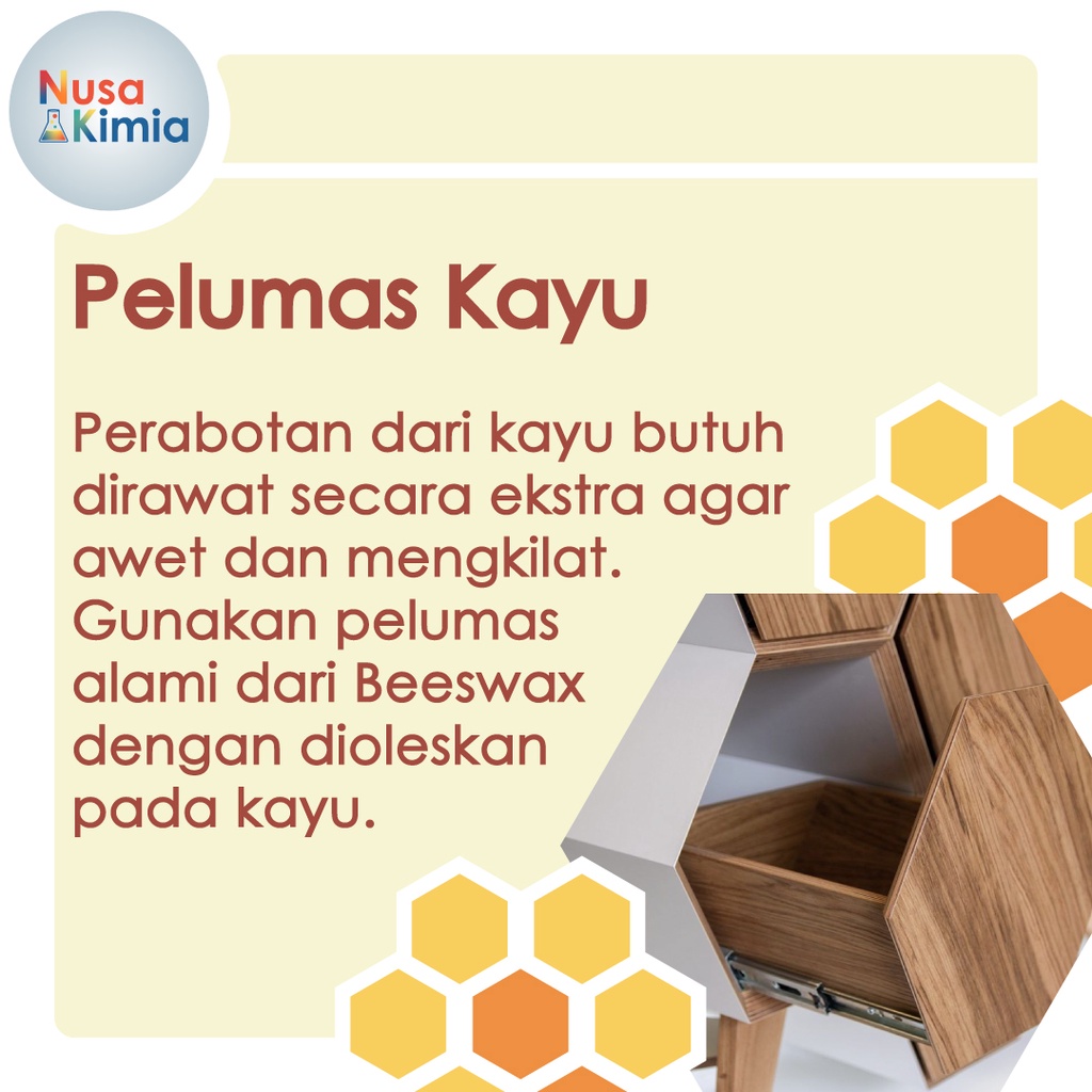 Beeswax dapat diaplikasikan pada : - Industri Kosmetik : Cream, Lotion, Lipstick, Lip Balm, dan Sun Care Products - Industri Farmasi : Ointment, Salves, Tablet Coating - Polish : Furniture, Kayu, Kulit, Automobile - Finish : Kulit, Tekstil, Kertas