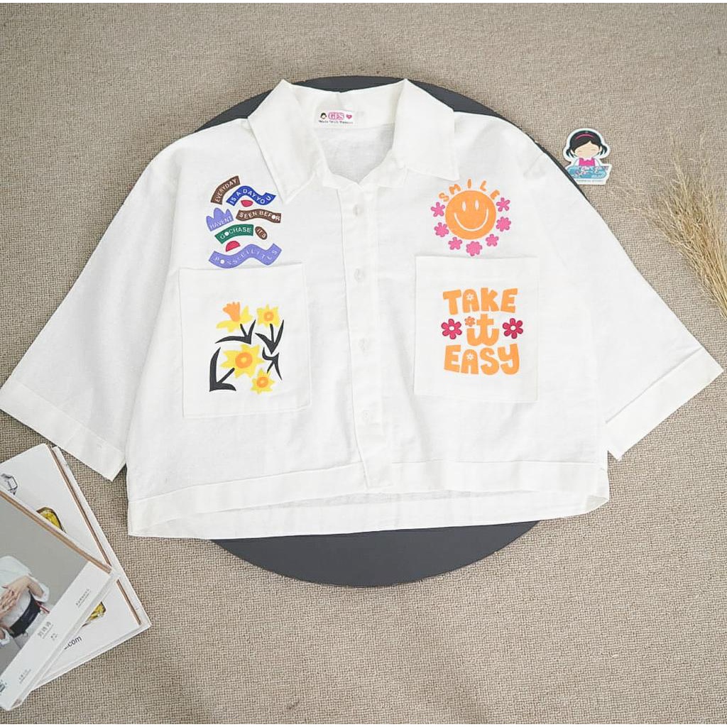 BEFAST - ZFS OOTD WANITA KEMEJA MIWA / ITS OKE LINEN POP UP CUTE SHIRT / Hem Crop Lengan 3/4 / Fashion Wanita Lucu Unik / OOTD Wanita Hangout / Kemeja Crop Wanita Terbaru / Pakaian Kekinian remaja ABG / Outfit Daily Wanita Terlaris