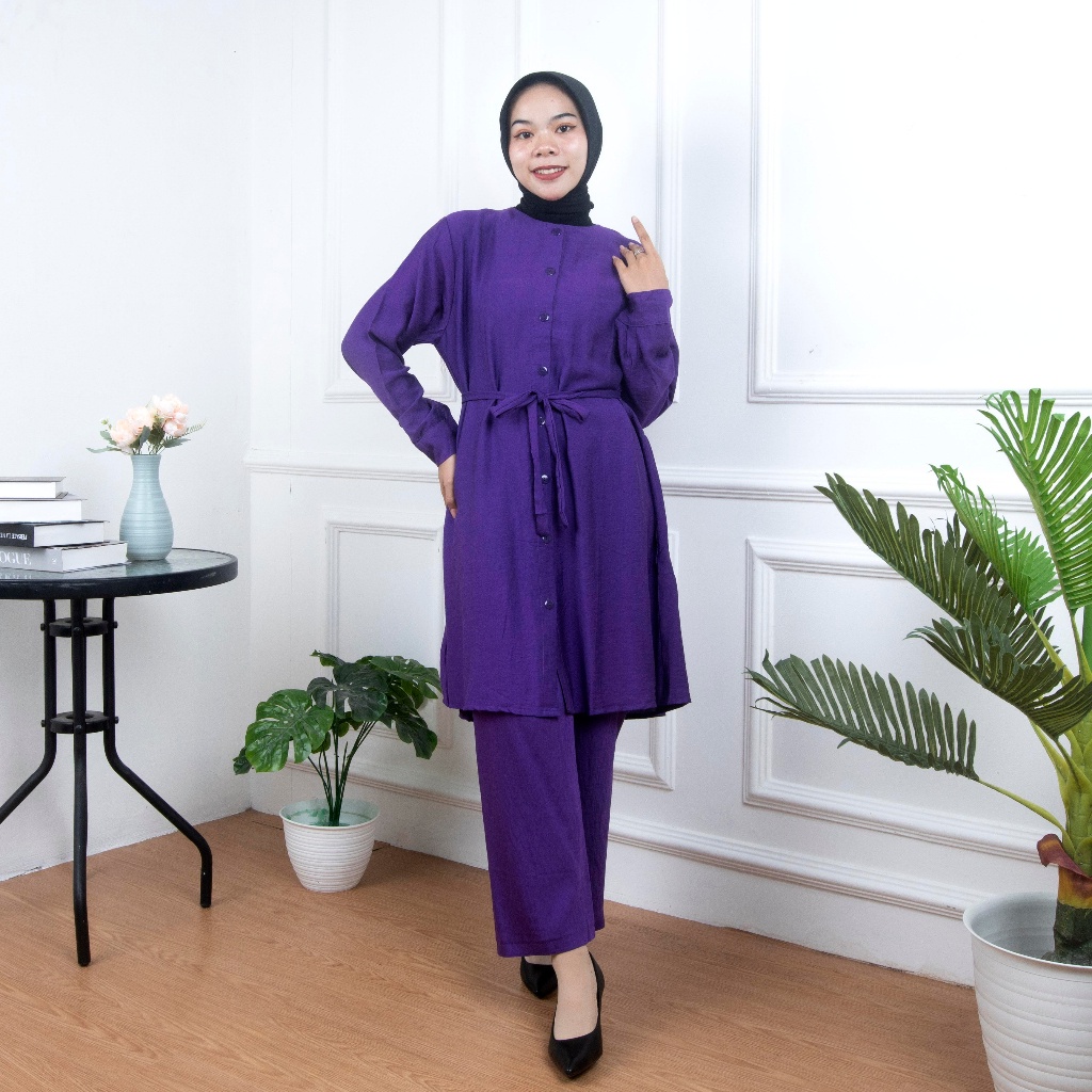 Detail Ukuran dan Detail Produk Atasan Ukuran : Allsize fit to XL Lingkar dada : 108cm Panjang : 94cm Panjang lengan : 53cm Bahan : Polo Linen Celana Lingkar pinggang : 58cm - 100cm Panjang : 90cm Bahan : Polo Linen