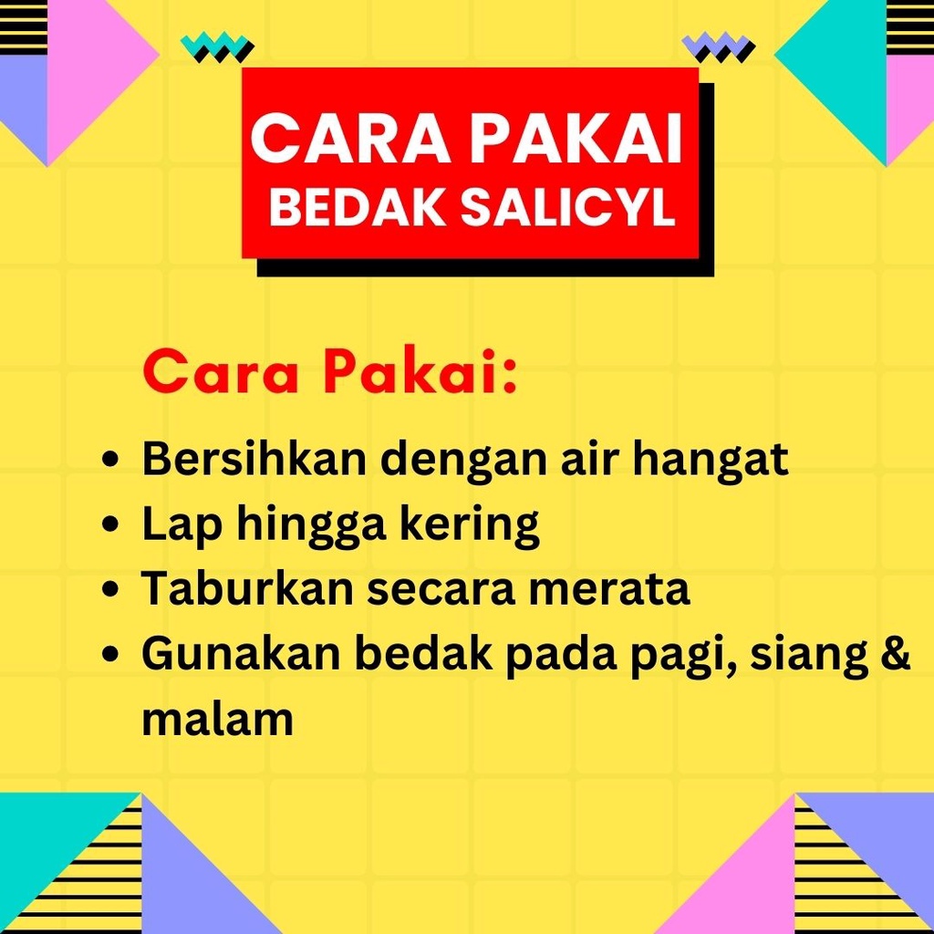 Bedak Salicyl mengandung Asam salisilat merupakan senyawa yang bersifat bakteriostatik (menghambat pertumbuhan bakteri), fungisida (membasmi jamur), dan keratolitik (membuang sel-sel kulit mati). Bedak Salicyl diformulasikan khusus untuk mengatasi segala masalah keluhan kulit seperti gatal menahun, alergi, biang keringat, kadas, kurap, dan penyakit kulit lainnya.