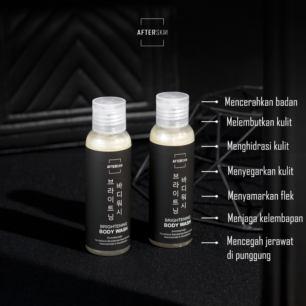 Afterskin Brightening Body wash adalah sabun pencerah badan pria dengan tekstur yang ringan bisa digunakan semua jenis kulit. Memililki kandungan Niacinamide, Glutathione yang dapat mencerahkan serta membuat kulit tampak glowing alami. Diperkaya dengan Scutellaria Baicalensis Root Extract mampu menjaga kelembapan kulit, menyamarkan noda hitam, melindungi kulit dari sinar UV. Sehingga kulit tambak lebih segar dan bercahaya. Hasil maksimal dengan pemakaian secara rutin.