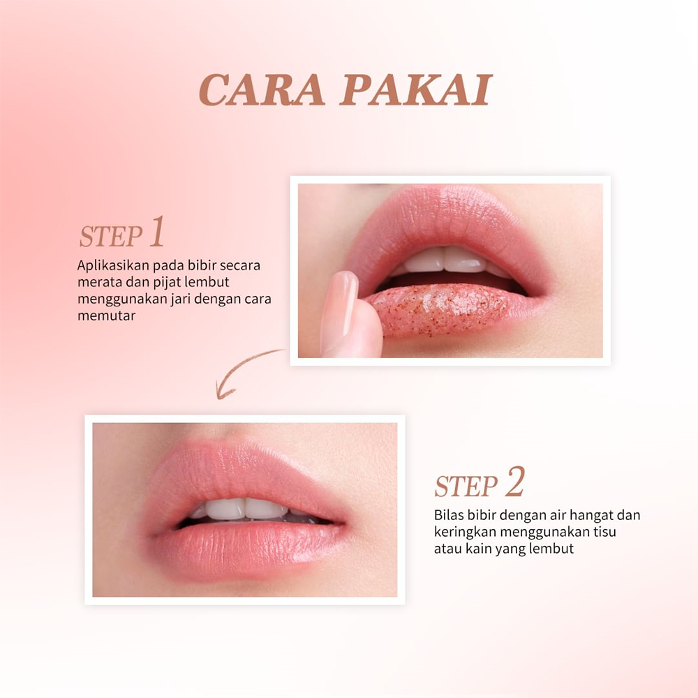 Benefits: 1. Gentle Exfoliation Diformulasikan dengan butiran gula halus yang dapat mengelupaskan sel kulit mati pada bibir dan menghaluskan bibir tanpa melukai bibir.