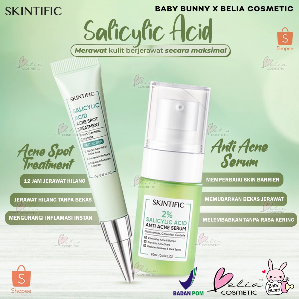 💚 SKINTIFIC Salicylic Acid BHA Acne Spot treatment 10g Obat totol jerawat berupa gel yang ampuh untuk mengatasi berbagai jenis jerawat dalam waktu 12 jam tanpa meninggalkan bekas di kulit. Diformulasikan dengan kombinasi active ingredients seperti Salicylic Acid + Pionin yang sudah terbukti tidak hanya bisa mengatasi jerawat aktif tapi juga bisa membunuh bakteri penyebab jerawat. Selain mengatasi jerawat aktif, acne spot ini juga dapat menenangkan dan mengurangi rasa sakit yang dirasakan dari jerawat hanya dalam 10 detik dari kandungan Centella, tambahan kandungan aktif lainnya seperti Niacinamide dan Ceramides juga dapat mencegah munculnya bekas jerawat dan tetap menjaga kelembaban dan kesehatan skin barrier.