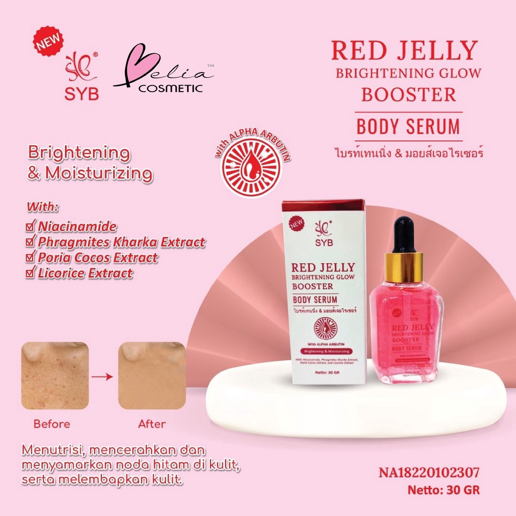 ❤ NEW SYB RED JELLY BRIGHTENING GLOW BODY SERUM WITH ALPHA ARBUTIN (Brightening dan Moisturizing) (30GR) Body serum yang menutrisi, mencerahkan dan menyamarkan noda hitam di kulit, serta melembapkan kulit. Body serum diformulasikan dengan bahan aktif alpha arbutin, Niacinamide sebagai brightening agent. Menjadikan kulit terasa halus, lembut, lebih cerah.