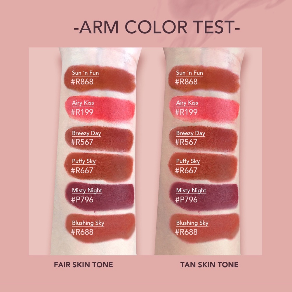 🍓Airy Matte Finish Formula Water-in-oil yang sangat ringan dan terasa nyaman digunakan. Memberikan hasil matte lembut serta warna bibir yang cerah natural.