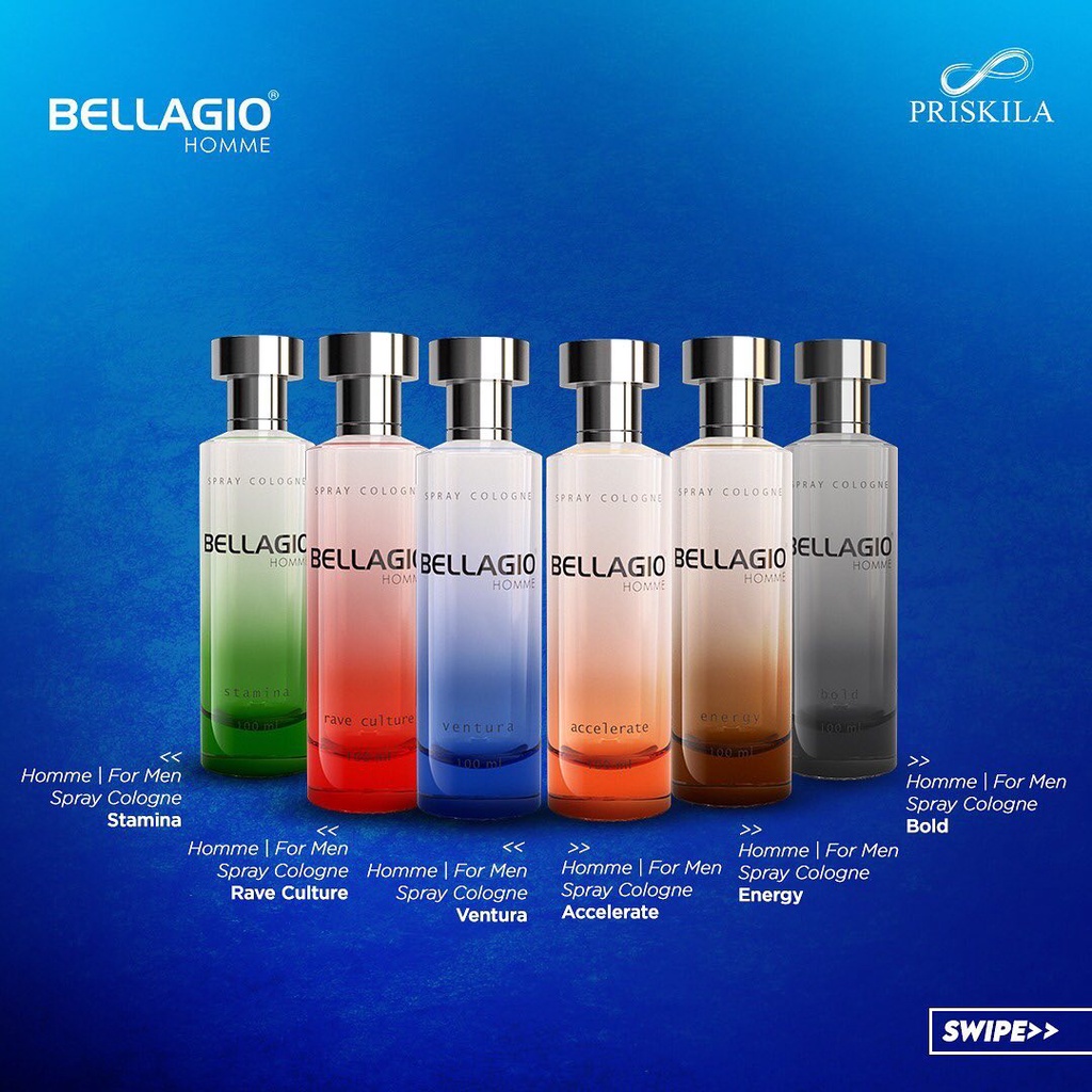 Parfum Bellagio memiliki banyak varian aroma seperti 1. hijau, (stamina) 2. merah, (rave culture) 3. biru, (ventura) 4. hitam (bold) 5. kuning, (accelerate) 6. Coklat (energy)