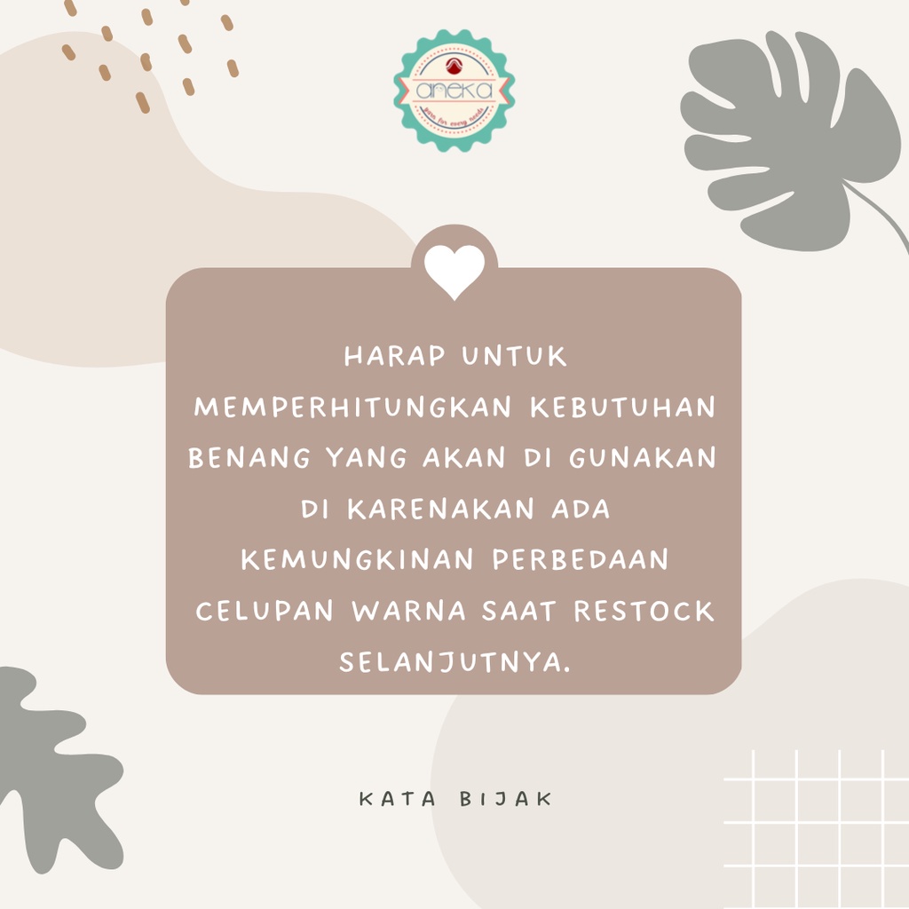 Note : Boleh Pilih warna dari katalog Benang Aster yg lainnya. Harap cantumkan kode warna di catatan/pesan pembeli, jika tidak ada catatan mohon maaf kami kirim RANDOM. Mohon Untuk TIDAK mencantumkan warna di CHAT untuk menghindari misscom.