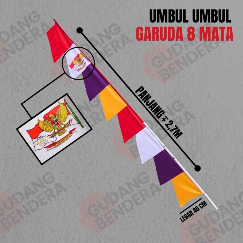 UMBUL UMBUL WARNA WARNI Bendera umbul-umbul merupakan variasi bendera dalam perayaan hari hari besar di Indonesia. Bentuk dasarnya adalah segitiga dan persegi empat yang dijahit membentuk satu pola memanjang ke atas. Kami memilih bahan yang berkualitas, tidak mudah robek dan berwarna terang untuk umbul umbul produksi kami.