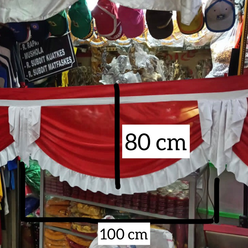 Bendera vitrase MOTIF merah putih VITRASE BACKGROUND MERAH PUTIH ADA 5 lengkungan Panjang 5 meter 1 lengkungan = 1 meter Bahan kain melamin Bahan lembut dan jatuh