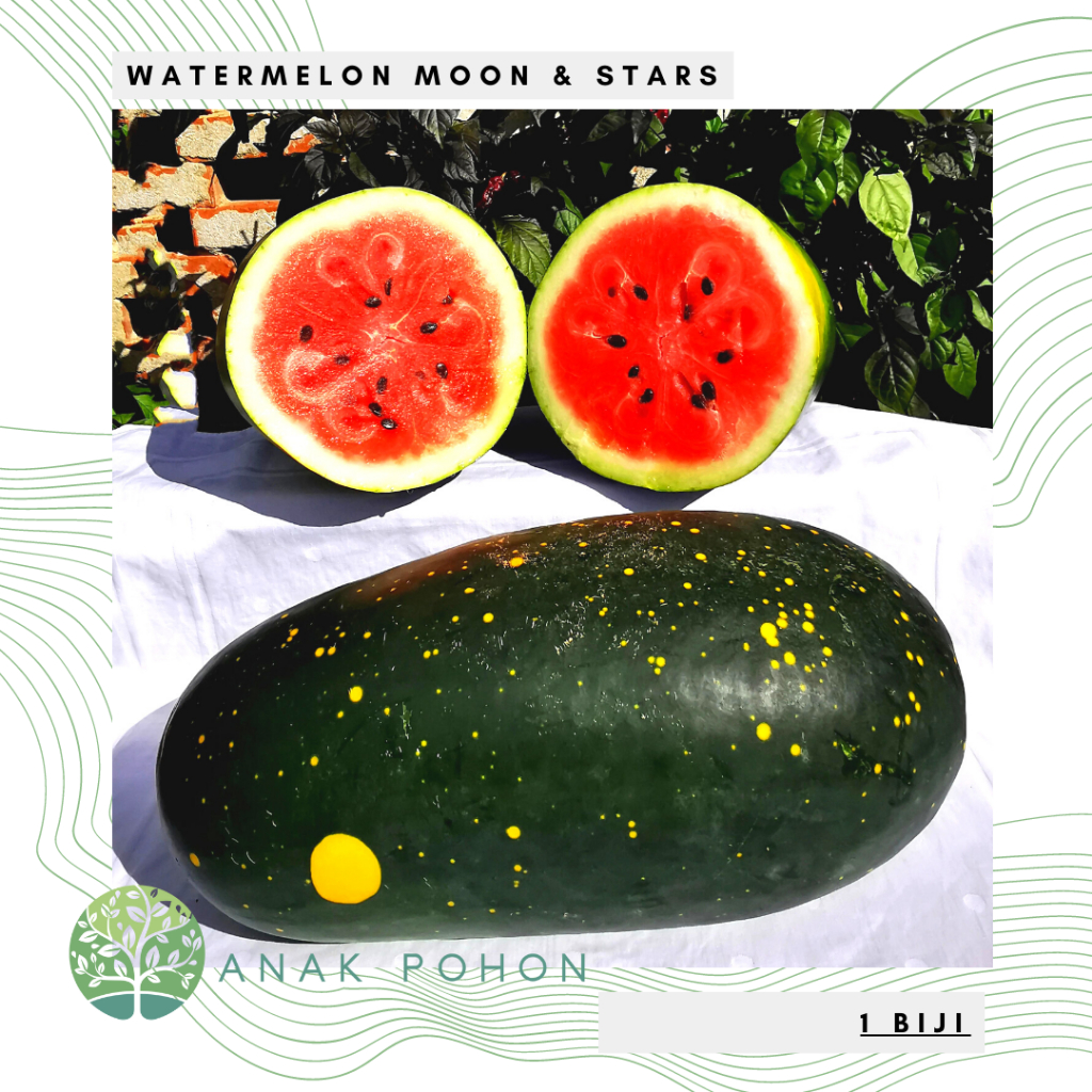 Watermelon Moon & Stars Pusaka terkenal dari AS yang berasal dari tahun 1926 dan mungkin bahkan lebih awal di Rusia. Ciri uniknya adalah kulitnya yang berpola surgawi: hijau tua dengan kilap emas cemerlang dan satu bintik bulan besar. Mereka dapat tumbuh hingga 20 kg, tetapi di Inggris Raya mereka cenderung lebih kecil dan paling baik ditanam di bawah kaca jika memungkinkan, karena mereka membutuhkan kehangatan. Daunnya juga berbintik-bintik kuning. Daging buahnya berwarna merah, sangat manis dan merupakan variasi kuliner yang sangat baik. Akan berjuang di luar di Inggris kecuali sangat terlindung dan kami memiliki musim panas yang baik.