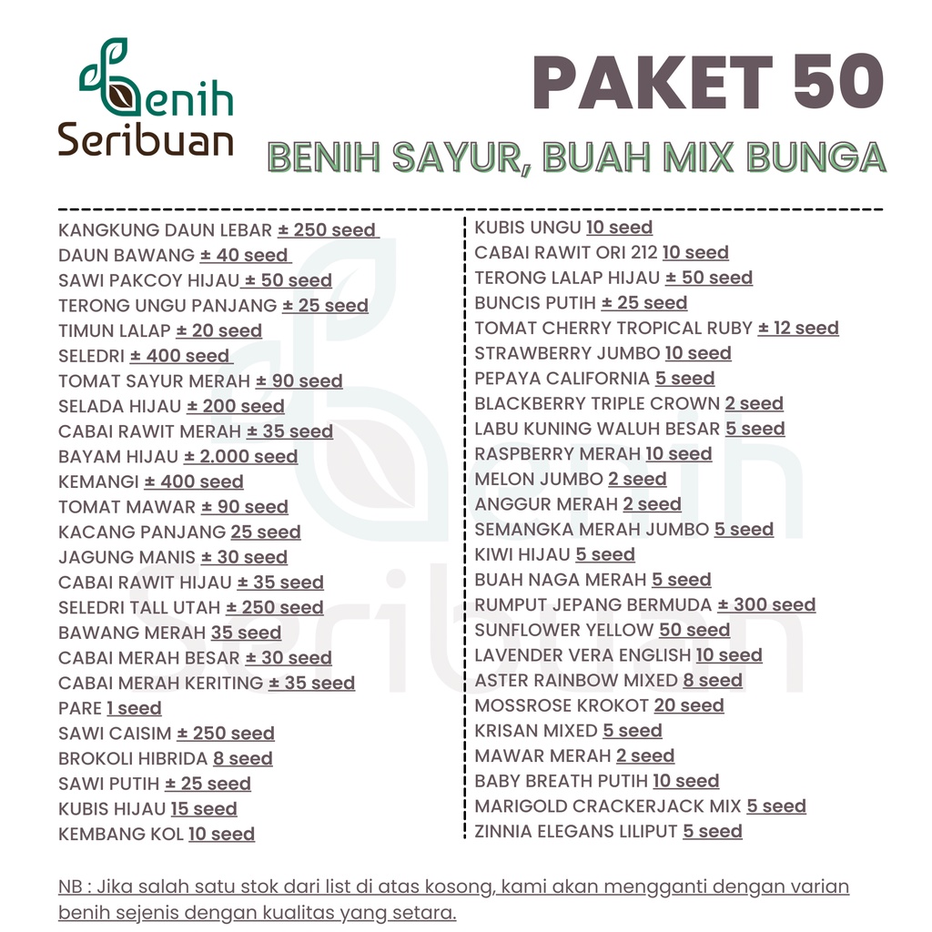 1. Kangkung Daun Lebar 2. Daun Bawang 3. Sawi Pakcoy Hijau 4. Terong Ungu 5. Timun Lalap 6. Seledri 7. Tomat Sayur 8. Selada Hijau 9. Cabai Rawit Merah 10. Bayam Hijau 11. Kemangi 12. Tomat Keriting 13. Kacang Panjang 14. Jagung Manis 15. Cabai Rawit Hijau 16. Seledri Tall Utah 17. Bawang Merah 18. Cabai Merah Besar 19. Cabai Merah Keriting 20. Pare 21. Sawi Caisim 22. Brokoli 23. Sawi Putih 24. Kubis Hijau 25. Kembang Kol 26. Kubis Ungu 27. Cabai Rawit ORI 212 28. Terong Lalap Hijau 29. Buncis Putih 30. Tomat Cherry Tropical 31. Strawberry Jumbo 32. Pepaya California 33. Blackberry 34. Labu Kuning Besar 35. Raspberry Red 36. Melon Jumbo 37. Anggur Merah 38. Semangka Merah 39. Kiwi Hijau 40. Buah Naga Merah 41. Rumput Jepang Bermuda 42. Sunflower Yellow 43. Lavender Vera 44. Aster Rainbow Mixed 45. Mossrose Krokot 46. Krisan Mixed 47. Mawar Merah 48. Baby Breath Putih 49. Marigold Crackerjack 50. Zinnia Elegans Mix