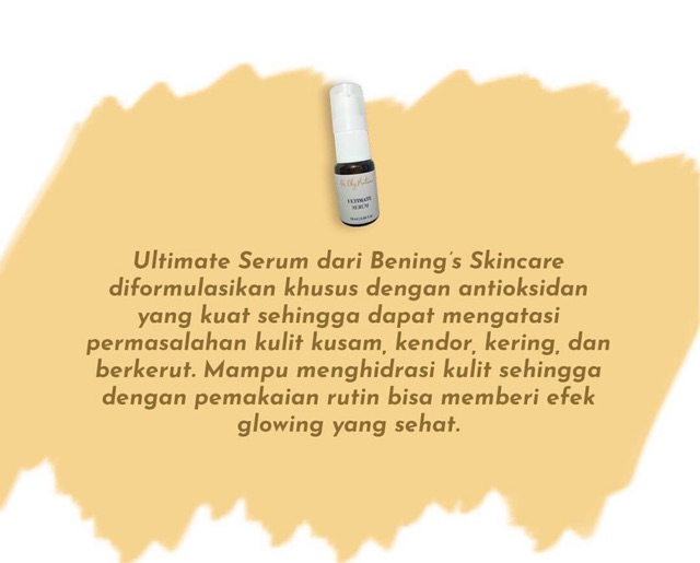 Ultimate Serum dari Bening's Clinic diformulasikan khusus dengan anti oksidant yang kuat sehingga dapat mengatasi permasalahan kulit kusam, kendor, kering dan berkerut. Mampu menghidrasi kulit sehingga dengan pemakaian rutin bisa memberikan efek glowing yang sehat