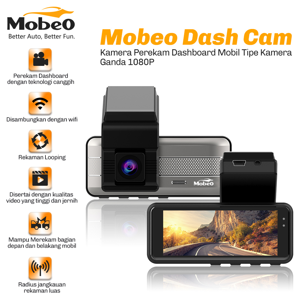 Mobeo Dash Cam Spesifikasi : -Video Resolution : HD1080P, HD720p - Camera angle : 120 degrees -Dilengkapi dengan dua Bahasa : Inggris dan mandarin - Dilengkapi dengan microphone/speaker - Frame Rate : 30 Fps, Memory Card : Class10 or above TF memory card 8Gb-32Gb