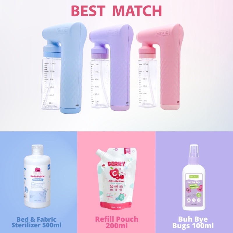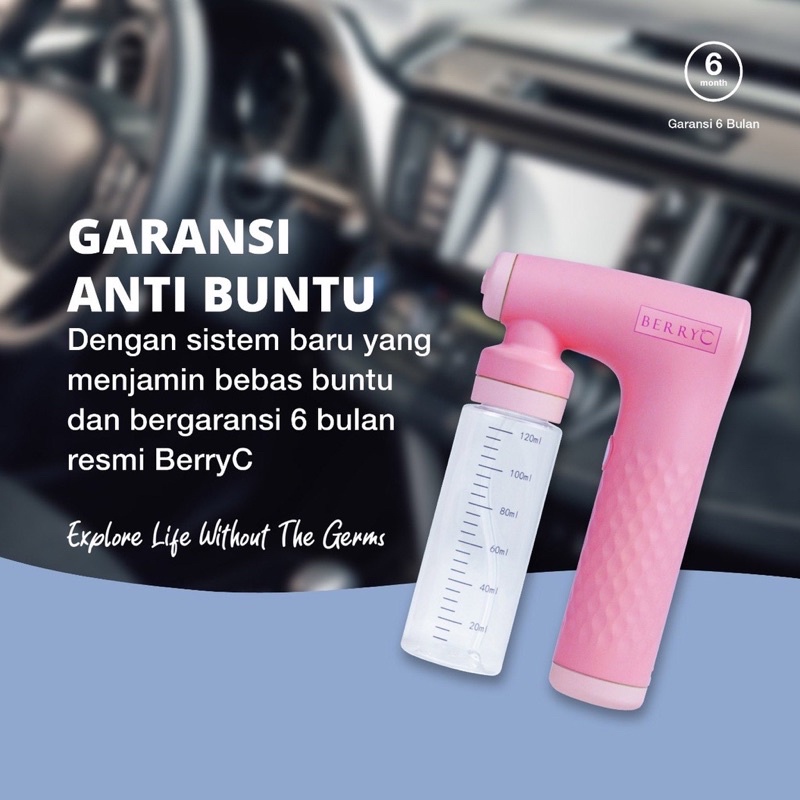Cara Penggunaan : 1. Putar botol untuk buka secara hati-hati 2. Masukkan cairan BerryC liquid maksimal 120ml sesuai indikasi 3. Putar botol untuk tutup secara hati-hati 4. Buka tutup karet di Mini Sanitizer Gun & tekan tombol ON di gagang 5. Arahkan ke objek yang akan disemprot dalam jarak minimal 30cm hingga 1m 6. Tekan tombol ON untuk mematikan 7. Buang sisa liquid & Simpan dalam posisi BERDIRI 8. Bila buntu, gunakan jarum untuk menusuk bagian nozzle dalam keadaan ON / menyala