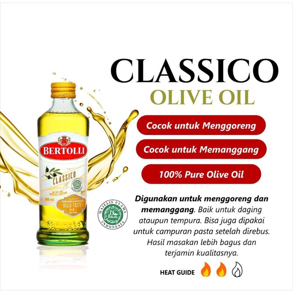 Bertolli Classico Olive Oil: o Hasil pemurnian dari ekstrak atau perasan minyak zaitun o Rasa dan aroma paling lembut o Cocok untuk diet o Stabil pada suhu tinggi o Komposisi: Refined Olive Oils dan Virgin Olive Oils
