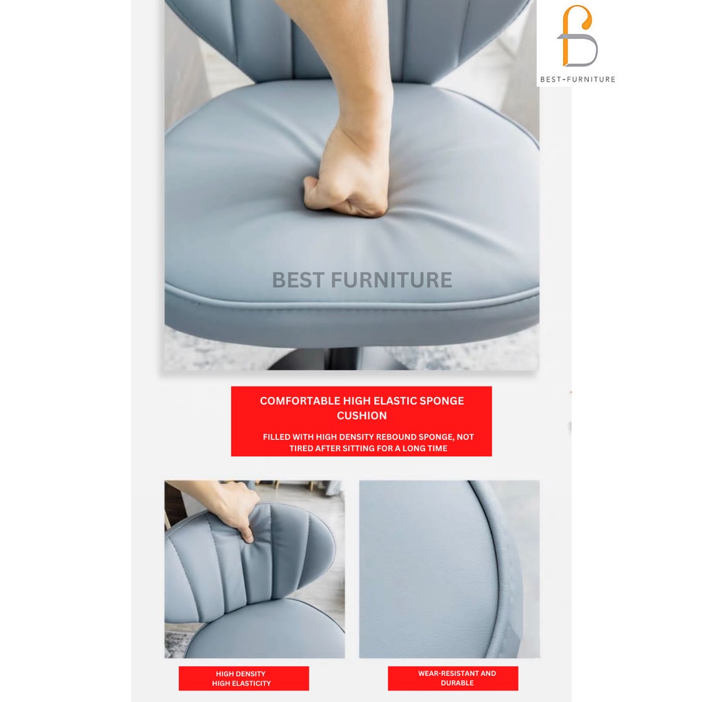 Deskripsi : -Desain Ergonomis -Dudukan Empuk , Lembut dan Nyaman - Hidrolik bisa naik turun - Kaki Stainless kualitas kuat dan kokoh -Produk Knockdown Self Assembly, Customer Merakit SendirI -Pengiriman se INDONESIA