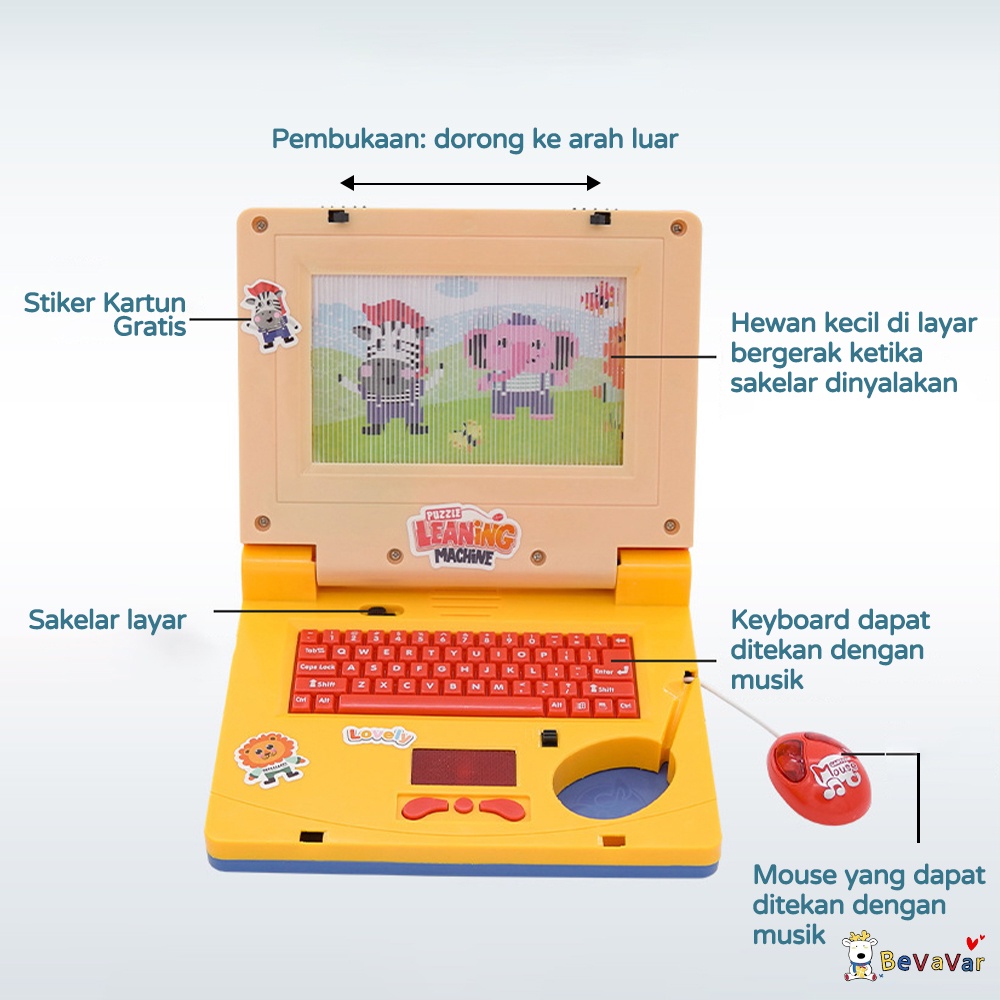 -Terdapat LED -Mini laptop ini berfungsi sebagai alat bantu belajar, yuks ajak -sikecil bermain sambil belajar, mereka pasti suka... -Mini laptop ini bergambar animasi lucu dengan