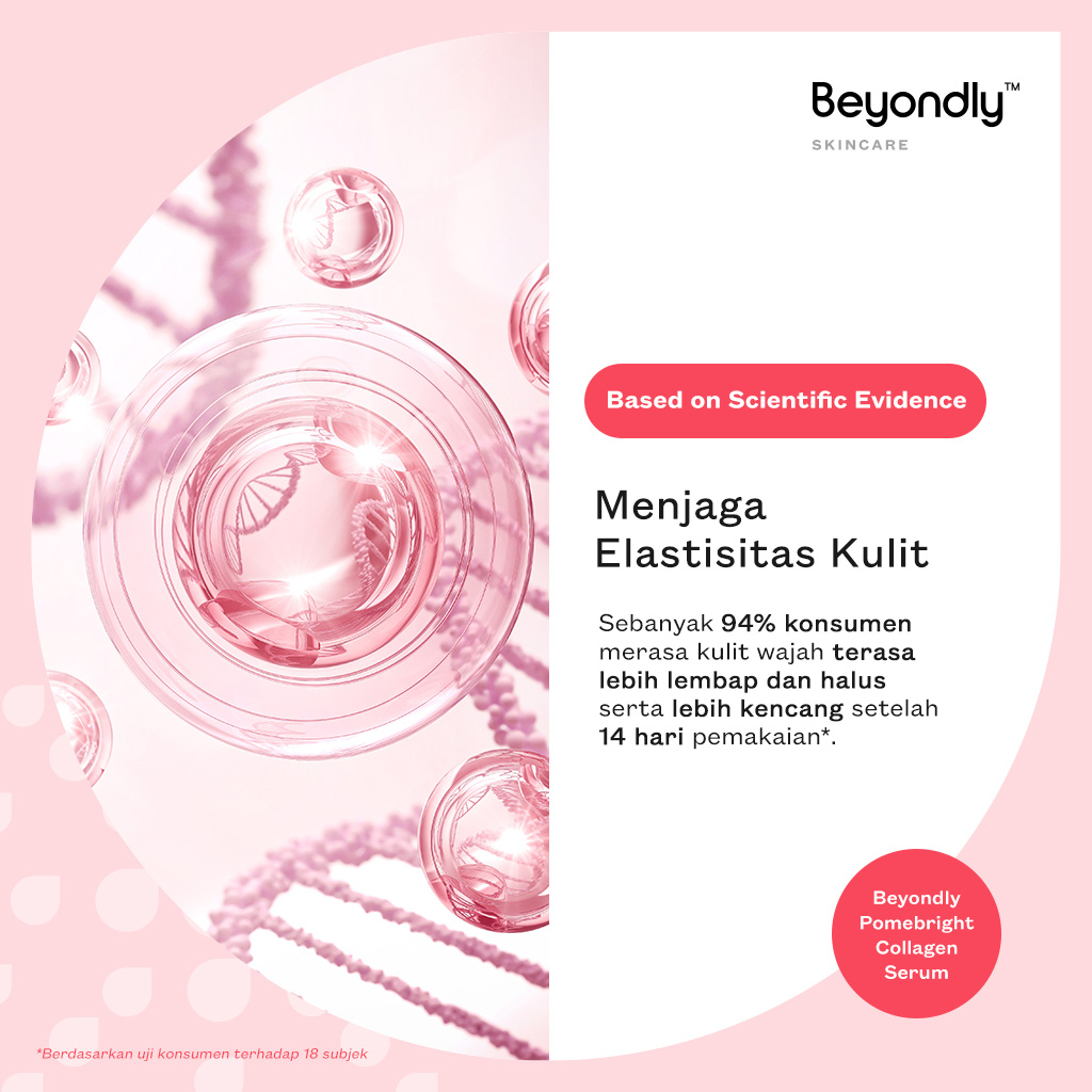 Beyondly Pomebright Collagen Serum diformulasikan dengan Micro-Molecular™ Collagen, Niacinamide, Pomegranate, Vitamin C, dan Hyaluronic Acid untuk membantu mencerahkan kulit kusam, menyamarkan bekas jerawat & flek hitam, dan meratakan warna kulit. Micro-Molecular™ Collagen memiliki ukuran molekul kecil (<1000 Da) sehingga dapat meresap lebih optimal untuk membantu meningkatkan elastisitas kulit dan kelembapan kulit. Teruji hypoallergenic dan cocok untuk semua jenis kulit.