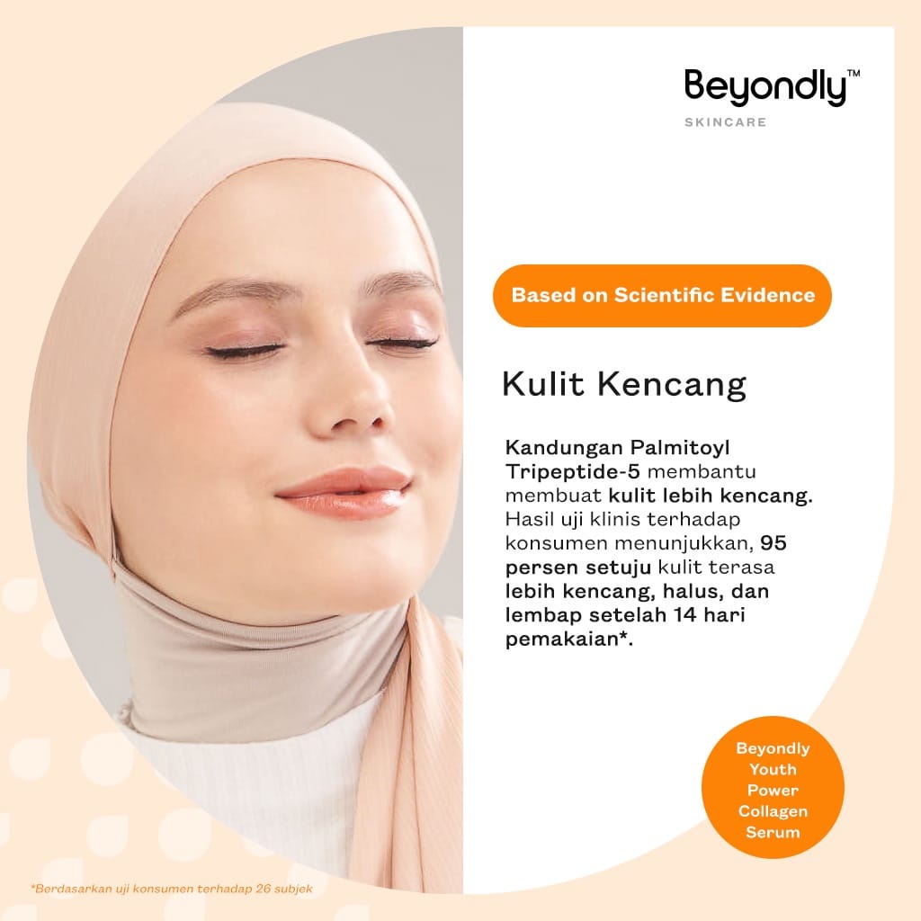 Beyondly Youth Power Collagen Serum diformulasikan dengan Micro-Molecular™ Collagen, Salmon DNA, Apple Fruit Cell Culture, Niacinamide, Matrixyl® 3000, dan Palmitoyl Tripeptide-5 untuk membantu menjaga elastisitas kulit, merawat proses regenerasi alamiah pada kulit, serta menyamarkan tanda-tanda penuaan dini seperti garis halus, flek hitam, dan kerutan pada kulit wajah. Micro-Molecular™ Collagen memiliki ukuran molekul kecil (<1000 Da) sehingga dapat meresap lebih optimal untuk membantu meningkatkan elastisitas kulit dan kelembapan kulit. Teruji hypoallergenic dan cocok untuk semua jenis kulit.