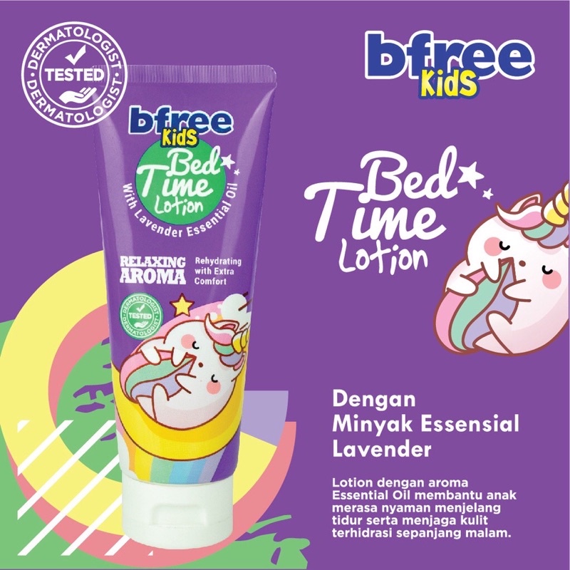 Bfree Kids Lotion, Perawatan untuk kulit si kecil tersedia 4 varian: 1. Bfree Kids Daily Lotion: Lotion dengan essential oil dengan keharupan natural, diformulasikan untuk melembabkan dan mengurangi dampak buruk polusi udara. Kandungan anti-bakterialnya membantu si kecil terhindar dari kuman. 2. Bfree Kids Mild Gentle Lotion: Tekstur lembut lotion ini diformulasikan untuk melembabkan kulit anak. Mild Gentle Lotion telah teruji secara dermatologis untuk si kecil yang memiliki kulit sensitive. 3. Bfree Kids Sunscreen Lotion: Lindungi kulit lembut si kecil dari sengatan sinar matahari dengan Bfree Kids Sunscreen Lotion. 4. Bfree Kids Bed Time Lotion: Lotion dengan aroma Essential Oil membantu si kecil merasa nyaman menjelang tidur serta menjaga kulit terhidrasi sepanjang malam.