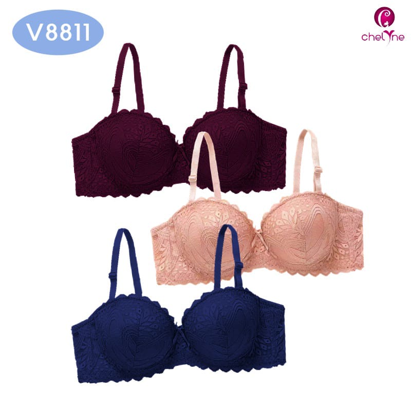 **V8811 : Busa push-up tebal di bagian bawah. Busa BH setebal 3,5 cm. Kaitan BH 2 kait 3 step di bagian belakang dan tali BH lebar 1.0 cm. Tersedia 3 pilihan warna dan dengan 3 pilihan ukuran. Ukuran 34/75 : Lingkar underbust = 65 cm. Ukuran 36/80 : Lingkar underbust = 68 cm. Ukuran 38/85 : Lingkar underbust = 72 cm. Toleransi melar adalah 12-16 cm.
