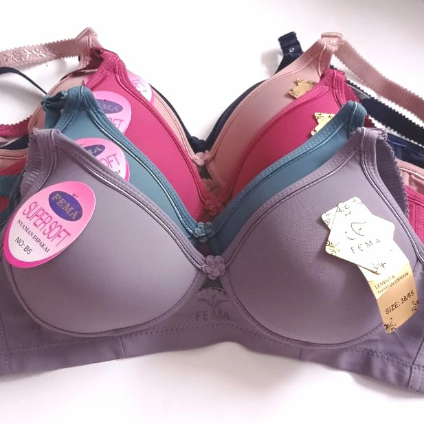Bh Fema B5 Melar elastis dan adem Bahan enak,halus dan lembut Nyaman dipakai sehari hari Bra tanpa kawat kancing 3 Harga 1 pcs SIZE 36/80 38/85 40/90 42/95 NOTE PENTING!!! 1. Sebelum membeli, silahkan sesuaikan ukuran dg yang sudah tertera diatas. 2. Tidak menerima komplain KEKECILAN/KEBESARAN karena sudah dijelaskan ukuran produk. 3. Warna dikirim RANDOM sesuai stok 4. KOMPLAIN KESALAHAN PENGIRIMAN SERTAKAN VIDEO UNBOXING PAKET! NO VIDEO TIDAK DILAYANI!! 5. MEMBELI = SETUJU
