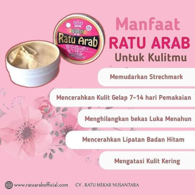 Manfaat dan keunggulan Bibit Ratu Arab 1. Memutihkan kulit secara cerah alami/natural 2. Memudarkan bekas luka dan strechmark 3. Melindungi kulit dari bahaya sinar UV 4. Meregenerasi sel kulit mati 5. Mengatasi kulit kering,melembabkan dan merawat kulit secara alami 6. Mencerahkan area lipatan seperti selangkangan dan bagian siku/lutut 7. Tidak membuat kulit menjadi tipis dan tanpa pengelupasan 8. Aman digunakan jangka panjang 9. Harga Terjangkau