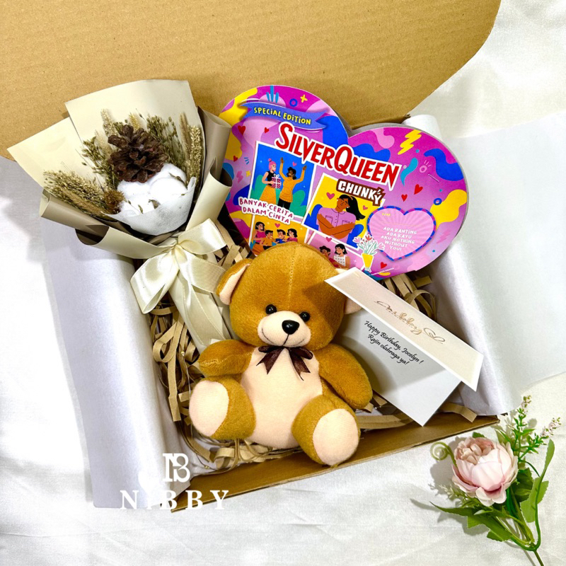 ~ Ukuran boneka -+ 15cm ~ Buket bunga kering ~ Silverqueen Love ~ Include box dan pita ~ Free kalendar mini selama persediaan masih ada ~ Free stiker
