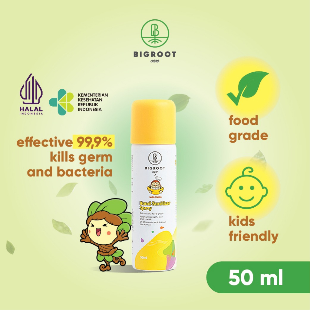 Bigroot Care Sang Pisang Hand Sanitizer Spray 50 ml dibuat dari komposisi bahan food grade yang aman dan praktis digunakan secara langsung setiap waktu. Berfungsi efektif untuk mensterilkan bakteri dan kuman baik pada tangan balita, anak-anak, maupun dewasa tanpa perlu dibilas dengan air. Produk ini juga sangat cocok diaplikasikan pada lingkungan sekitar anda seperti tempat bermain anak maupun pada tempat-tempat umum ketika bepergian
