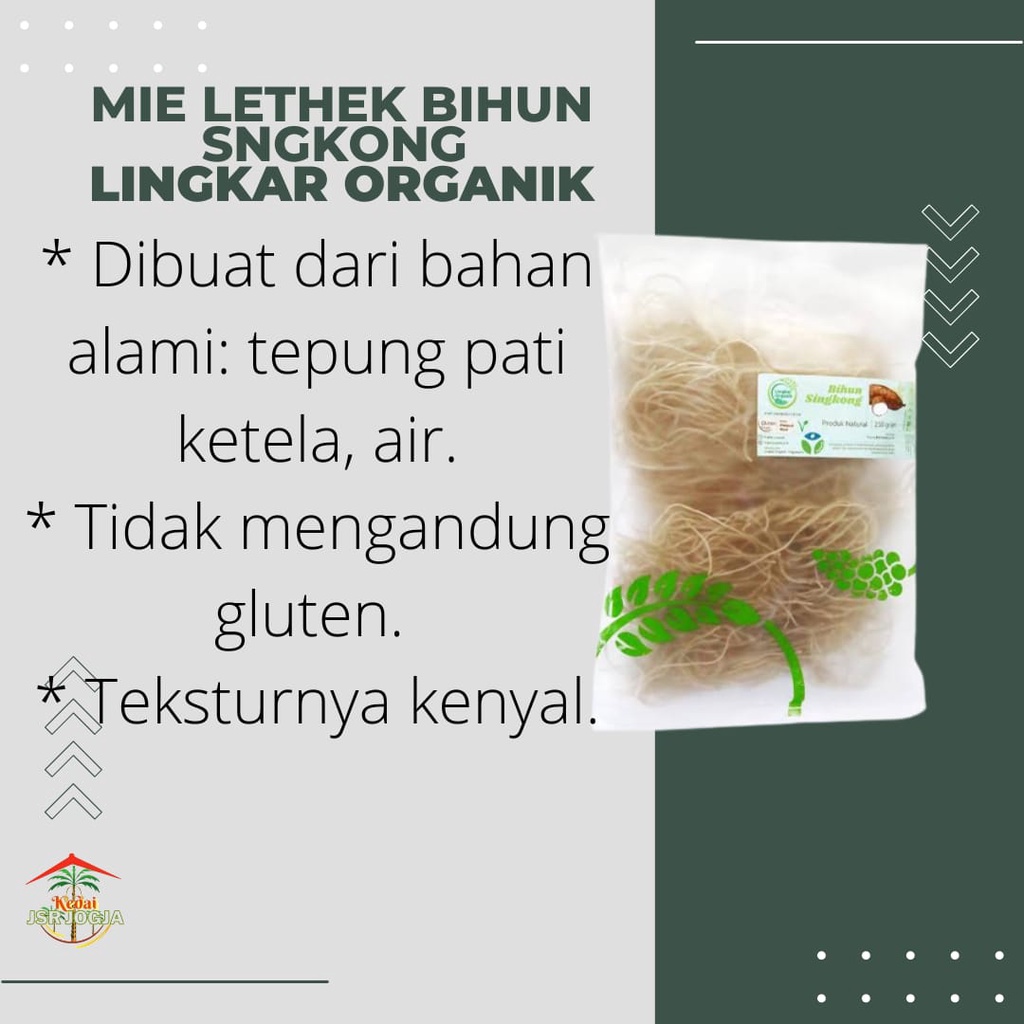 * Dibuat dari bahan alami: tepung pati ketela, air. * Tidak mengandung gluten. * Teksturnya kenyal. • berat mie 250 gram akan tetapi krn bentuknya yg ngembang dan ada space udara jadi pengaruh di volume untuk ongkir ya kak . 5 bungkus mie lethek bisa masuk 4 kg .