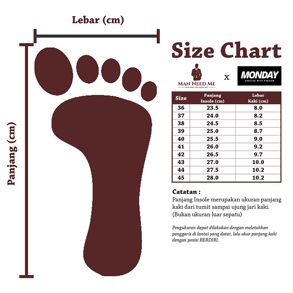 Size Chart (Insole/Panjang kaki) : Size 36 : panjang 23,5 cm, lebar 8,0 cm Size 37 : panjang 24,0 cm, lebar 8.2 cm Size 38 : Panjang 24,5 cm, lebar 8.5 cm Size 39 : Panjang 25,0 cm, Lebar 8,7 cm Size 40 : Panjang 25,5 cm, Lebar 9,0 cm Size 41 : Panjang 26,0 cm, Lebar 9,2 cm Size 42 : Panjang 26,5 cm, Lebar 9,7 cm Size 43 : Panajng 27,0 cm, Lebar 10,0 cm Size 44 : Panjang 27,5 cm, Lebar 10,2 cm (Untuk cara Pengukuran, silakan lihat di panduan ukuran)