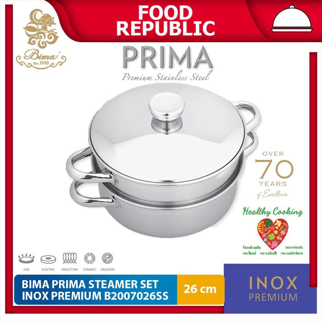 BIMA PANCI STEAMER 26 CM KUKUS B2007026SS 2 TINGKAT SUSUN ORIGINAL 100% Item: Bima Prima Steamer Set 26cm Art No: B2007026ss Handle: Durable SS Side Handle Material: Inox Premium Base Panci: 1-Ply / Single-Ply Seri Prima: