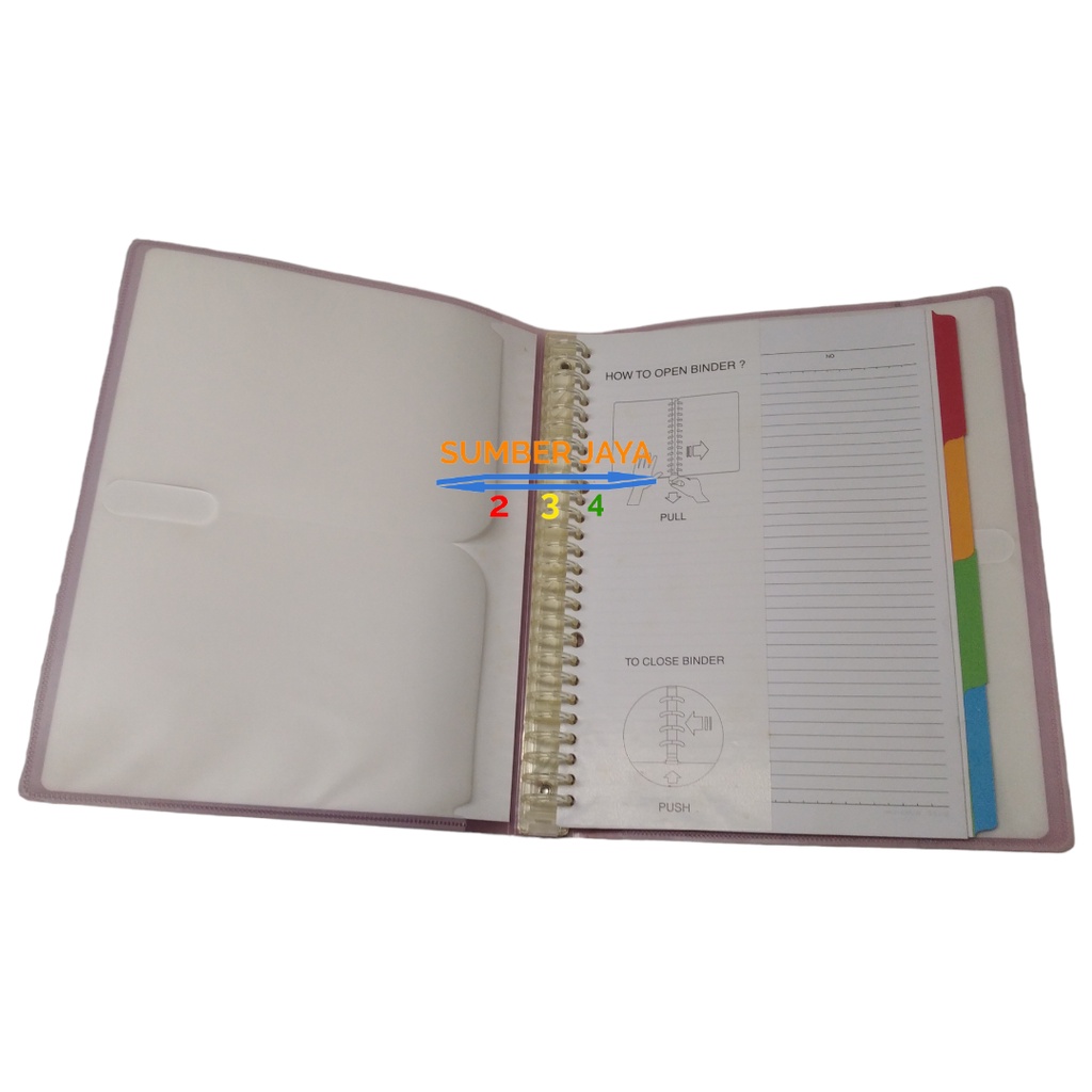Ukuran : B5 (27,5 x 21,5) Terdapat 26 holes / lubang Include 1 sheet Protector, 4 sheeets index / pembatas, dan 10 lembar isi Loose Leaf Warna dan motif yang dikirim random