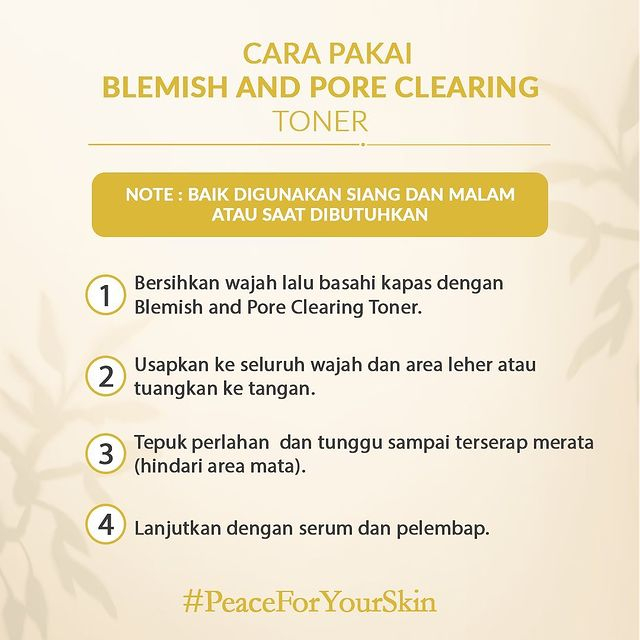 Cara Pakai : Baik digunakan siang dan malam atau saat dibutuhkan. Bersihkan wajah lalu basahi kapas dengan Blemish and Pore Clearing Toner dan usapkan ke seluruh wajah hingga leher atau tuangkan ke tangan, tepuk perlahan dan tunggu sampai terserap merata ( hindari area mata ). Lanjutkan dengan serum dan pelembap.