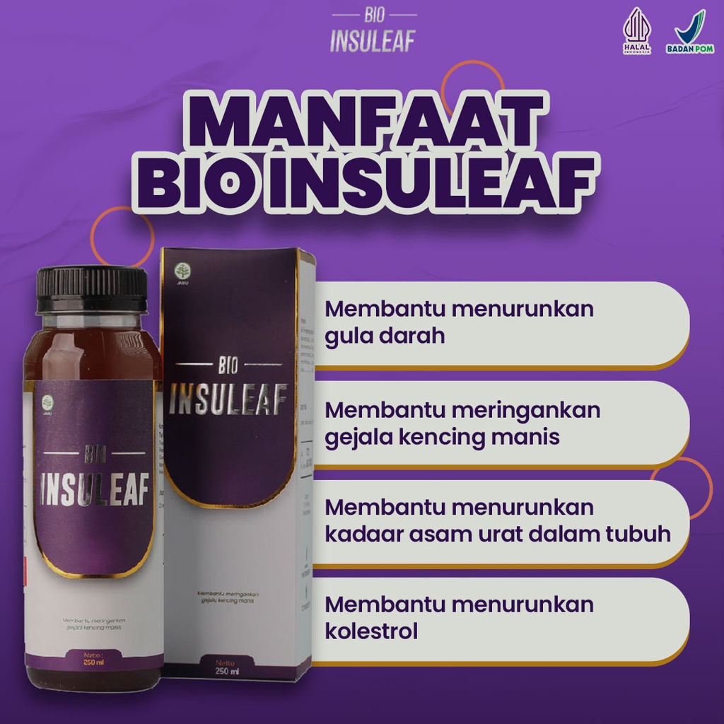Manfaat dari Bio Insuleaf untuk membantu menurunkan gula darah, membantu meringankan gejala kencing manis, membantu menurunkan kadar asam urat dalam tubuh, dan membantu menurunkan kolesterol.