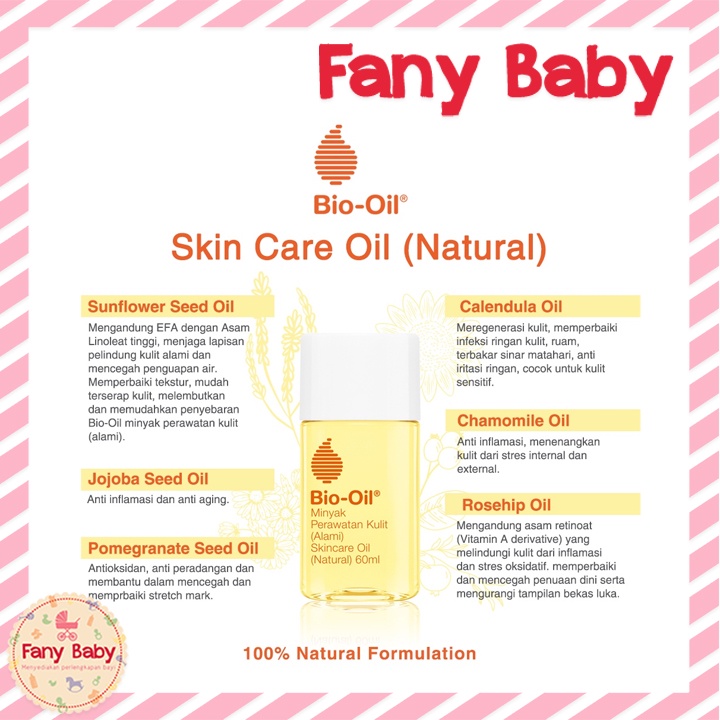 Bio-Oil Skincare Oil Natural adalah produk spesialis perawatan kulit untuk membantu menyamarkan scars dan stretch marks yang terbuat dari 100% bahan alami.