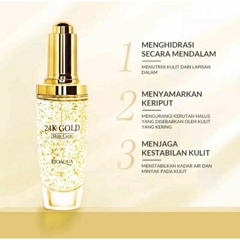 SKINCARE (SERUM) 30 & 50ml Memiliki tekstur ringan yang dapat dengan mudah diserap oleh kulit tanpa menimbulkan rasa lengket Kandungan emas pada 24K Gold Skincare dapat secara efektif untuk mengatasi tanda-tanda penuaan Menghidrasi kulit kering dan menenangkan kulit sensitif yang mudah kemerahan