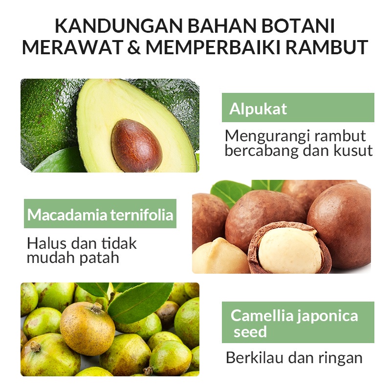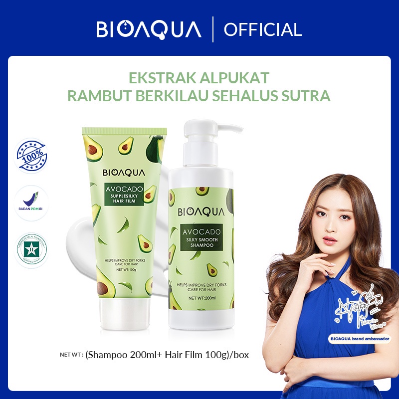 BIOAQUA Avocado Hair Care Series Set BPOM :NKIT220000302 NET WT: (Shampoo 200ml+ Hair Film 100g)/box EKSTRAK ALPUKAT RAMBUT BERKILAU SEHALUS SUTRA PERAWATAN PEMBERSIHAN DENGAN ALPUKAT Membersihkan Menyegarkan dan bebas ketombe Merawat Halus, lembut dan ringan Menutrisi Rambut lebih kuat & berkilau MENYEGARKAN DAN BEBAS KETOMBE Mudah dibilas, menyegarkan dan menghaluskan TEKNOLOGI SELEMBUT SUTRA Memperbaiki rambut kering dan bercabang Menutrisi dan mengurangi rambut patah Rambut kuat dan berkilau Meningkatkan kelenturan rambut, mengurangi rambut rontok DENGAN PENGGUNAAN SECARA RUTIN Memperbaiki kerusakan rambut Rambut halus & lembut Rambut kuat & berkilau CARA PENGGUNAAN Shampoo: 1. Tuangkan secukupnya ke tangan, usapkan secara merata pada rambut yang telah dibasahi 2. Setelah berbusa, pijat kulit kepala dan rambut dengan lembut, lalu bilas hingga bersih. Masker rambut: Setelah mencuci rambut, ambil masker rambut secukupnya dan aplikasikan ke rambut, usap secara lembut, lalu bilas hingga bersih. PRODUCT INFORMATION Product Name:Avocado Hair Care Series Set Net Weight:(Shampoo 200ml+ Hair Film 100g)/box Shelf Life: 3 Years Core Ingredients : Avocado,Camellia japonica seed,Macadamia ternifolia Efficacy: Smooth and shiny hair,Repair split ends and dry hair