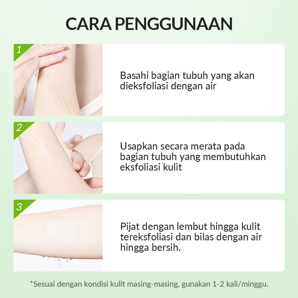 CARA PENGGUNAAN STEP 1: Basahi bagian tubuh yang akan dieksfoliasi dengan air STEP 2: Usapkan secara merata pada bagian tubuh yang membutuhkan eksfoliasi kulit STEP 3: Pijat dengan lembut hingga kulit tereksfoliasi dan bilas dengan air hingga bersih. *Sesuai dengan kondisi kulit masing-masing, gunakan 1-2 kali/minggu.